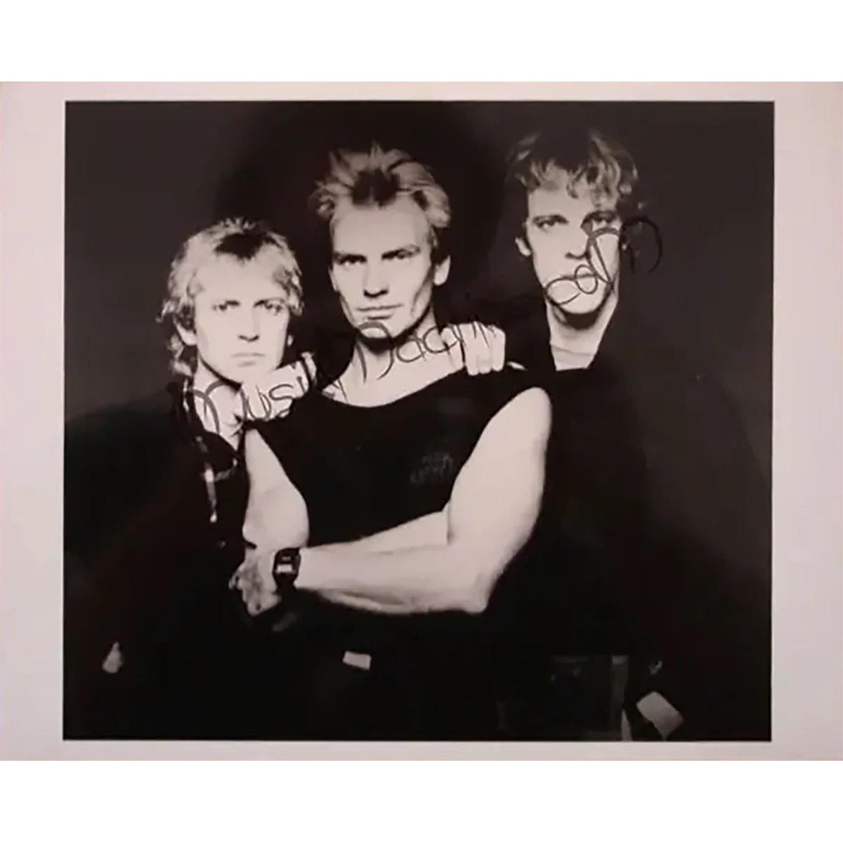 Cette photographie glacée noir et blanc de 20 x 25 cm capture The Police dans une pose symbolique d’unité et de force. Sting, au centre, montre une posture ferme et musclée, les bras croisés, avec Andy Summers et Stewart Copeland posant juste derrière lui. Un portrait devenu emblématique, régulièrement utilisé dans les articles et biographies du groupe.